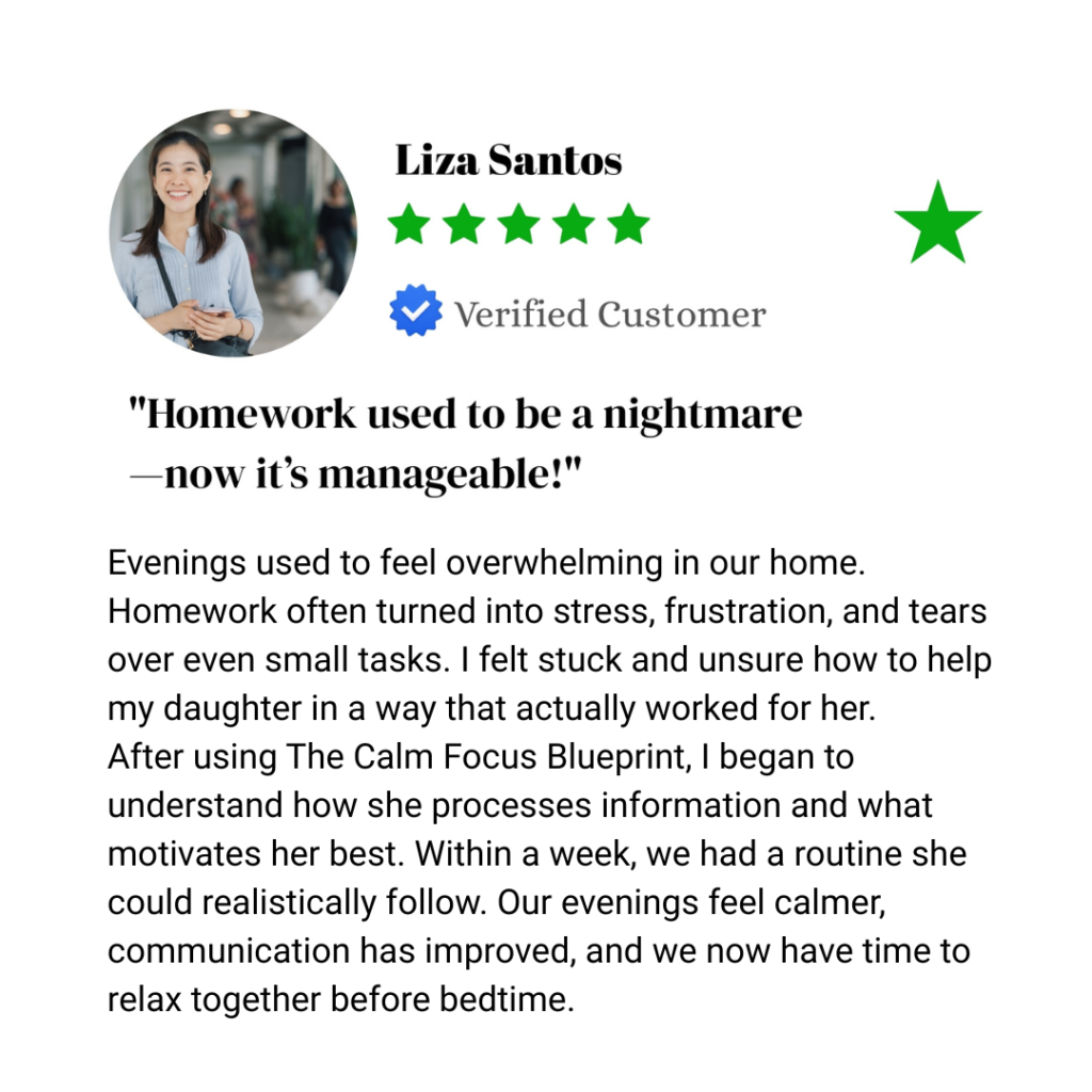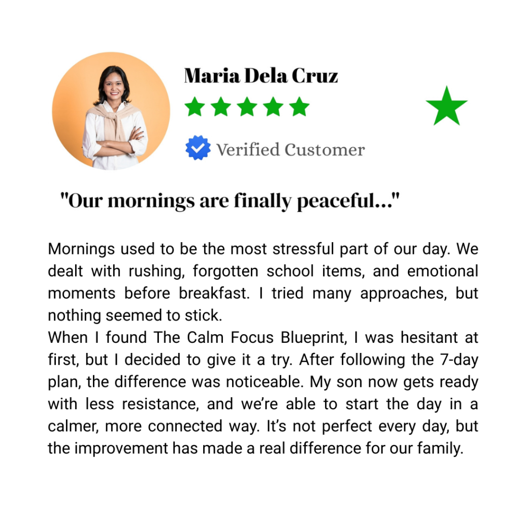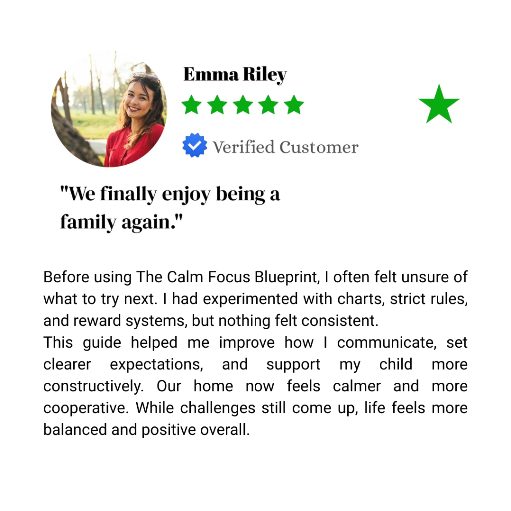 Many parents come to this guide after experimenting with different routines, charts, or advice that didn’t fit their family’s daily life. The Calm Focus Blueprint is designed to offer practical, flexible strategies parents can adapt to their own routines—without rigid systems or one-size-fits-all approaches.